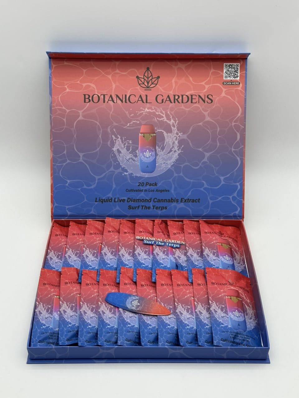 Botanical Gardens 2G Disposable captures pure California craftsmanship in a sleek, rechargeable vape. Filled with liquid live diamond cannabis extracts cultivated in Los Angeles, this 2‑gram disposable delivers clean, full‑spectrum flavor and smooth potency in every puff. Designed for reliability with clog‑free airflow and rechargeable convenience, each unit is packaged fresh—20 disposables per box for premium quality control. Botanical Gardens invites you to Surf the Terps, exploring vibrant flavor waves and balanced effects that define the next generation of cannabis vaping. Ideal for connoisseurs and newcomers who value taste, purity, and authentic California energy.