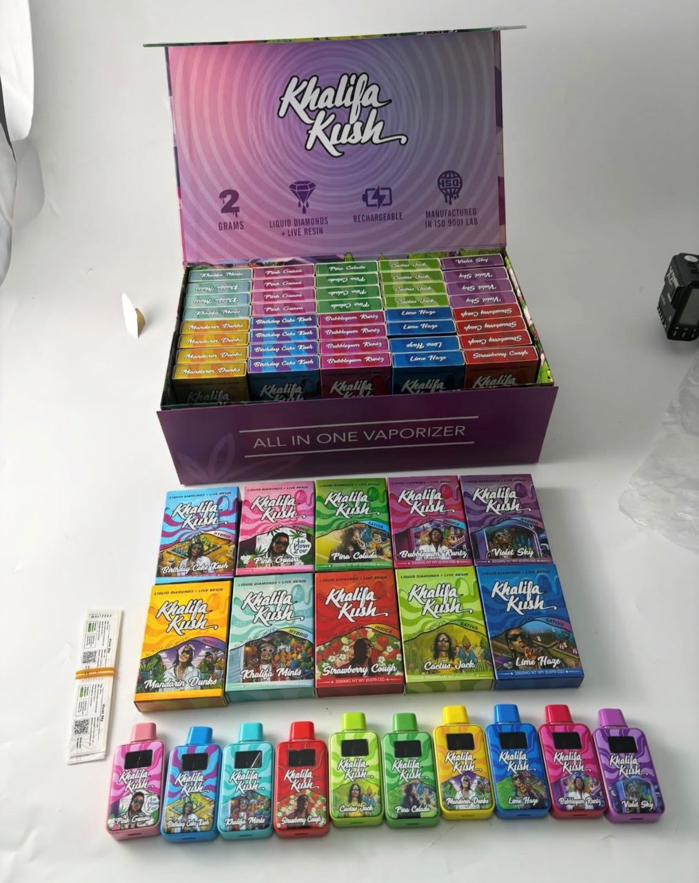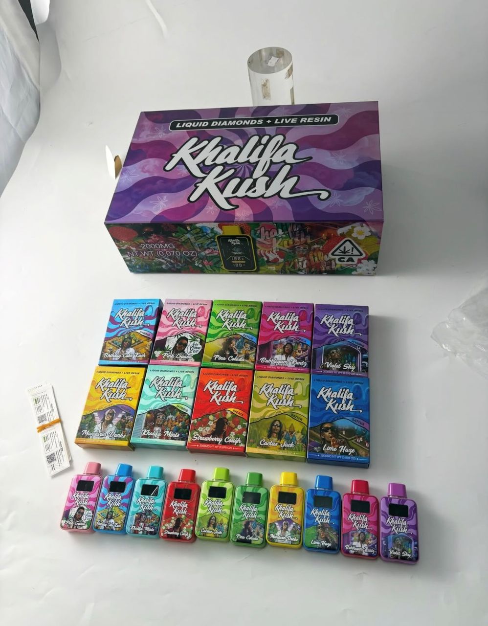 | Flavors and Quantity | BIRTHDAY CAKE KUSH, PINK GUAVA, PINA COLADA, BUBBLEGUM RUNTZ, VIOLET SKY, LIME HAZE, CACTUS JACK, STRAWBERRY COUGH, KHALIFA MINTS, MANDARIN DUNKS, FULL BOX |