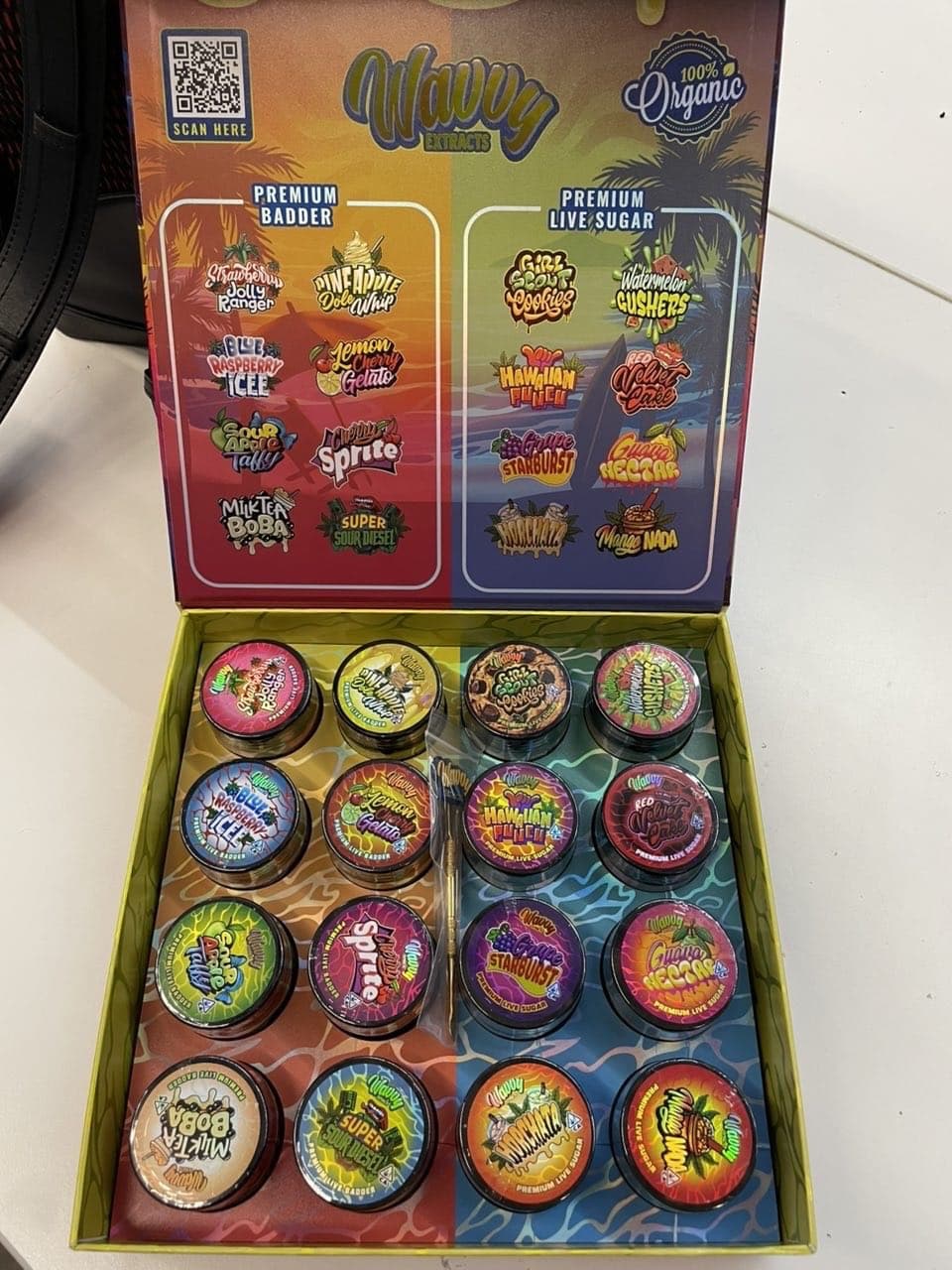 | Flavors and Quantity | STRAWBERRY JOLLY RANCHER ( badder), PINEAPPLE DOLE WHIP ( badder), LEMON CHERRY GELATO ( badder), BLUE RASPBERRY ICEE( badder), SOUR APPLE TAFFY ( badder), CHERRY SPRITE ( badder), MILKTEA BOBA SUPER SOUR DIESEL ( badder), GSC (live Sugar), WATERMELON GUSHERS (live Sugar), HAWAIIAN PUNCH (live Sugar), RED VELVET CAKE (live Sugar), GRAPE STARBURST (live Sugar), GUAVA NECTA (live Sugar), MANGO NADA (live Sugar), HOCHATA (live Sugar), FULL BOX |